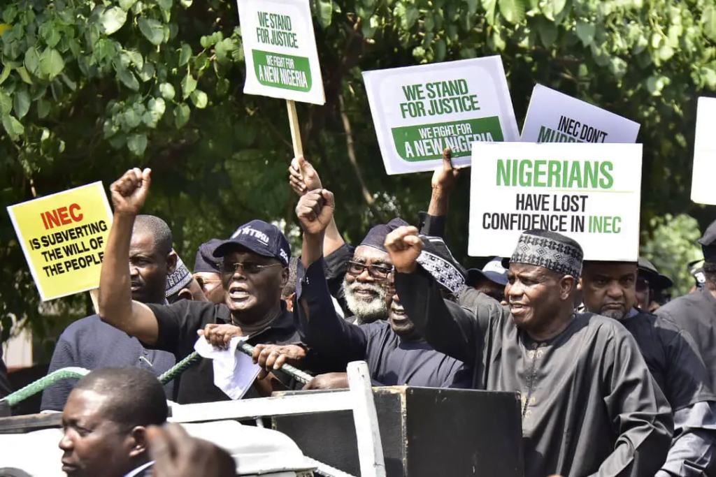 Atiku, Ayu, others lead protest to INEC headquarters Atiku Abubakar, the Presidential Candidate of PDP and his vice, Ifeanyi