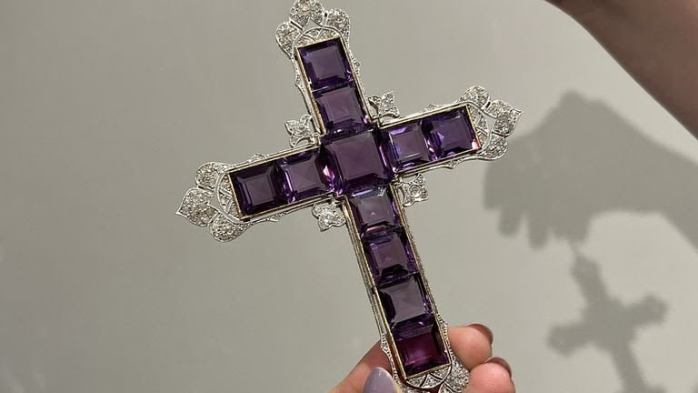 The cross pendant has square-cut amethysts and is accented by circular-cut diamonds, has a total diamond weight of approximately 5.25 carats.