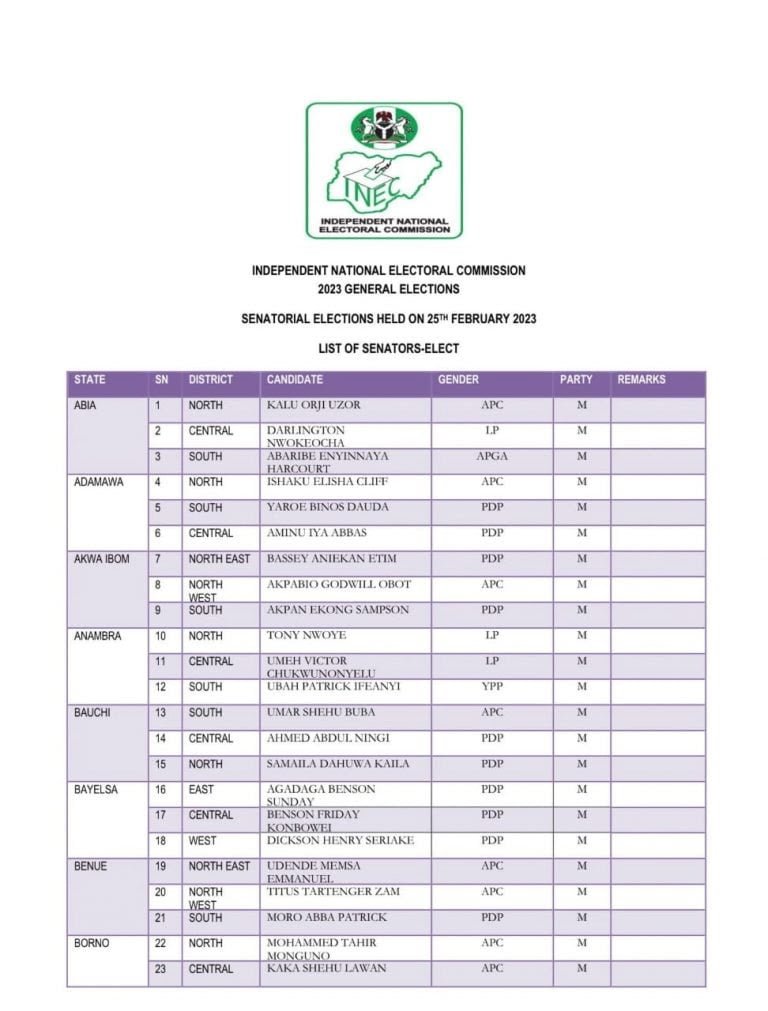 The Independent National Electoral Commission (INEC) has released the full list of Senators-Elect of the 10th Senate.