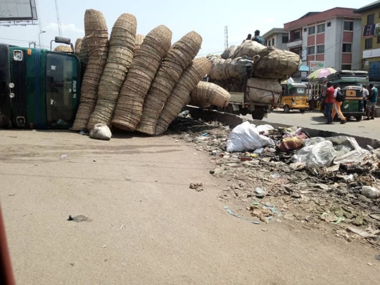 On Friday, a fully loaded truck carrying baskets fell on the road. This incident occurred at New Tarzan Motors at the Upper Iweka Junction along the Onitsha-Owerri Road, Anambra State. The crash happened while the driver was trying to navigate the bad portion of the road. No lives were lost.